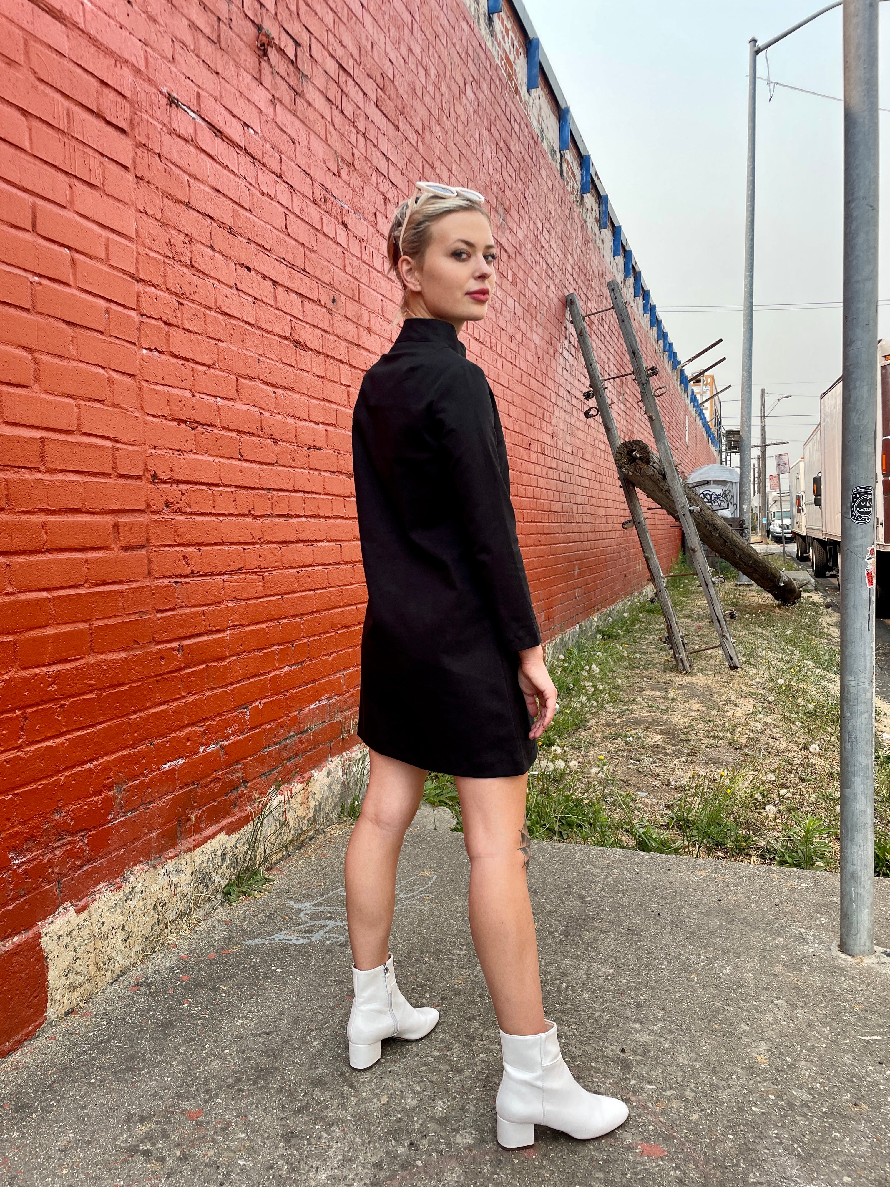 The name says it all. The Art Teacher is versatile, functional, and fun! Made in a heavier weight stretch twill, this dress features an asymmetrical brass zipper with a circle pull that can be worn zipped all the way up, or open like a jacket. The essential exterior pocket has two compartments for all your classroom/studio/workshop needs, also adorned with a circle pull zipper to match. Sleeves are slightly cropped, so you art teachers can get right to work.