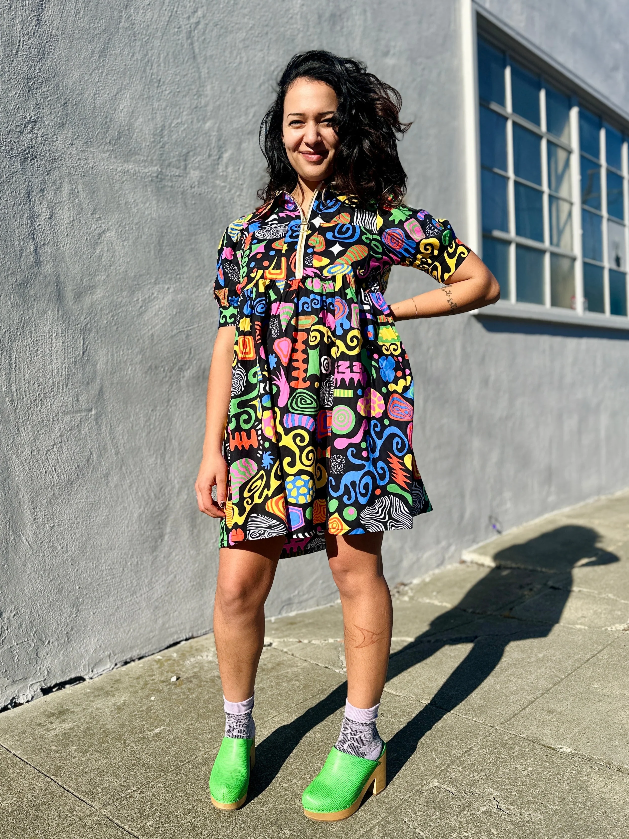 This babydoll dress features an empire waist and '70s-style o-ring zipper at the bust. It falls mid-thigh in length, has a classic collar, two patch pockets on the chest, and puff sleeves. It's crafted from our lightweight cotton poplin for an airy silhouette. Style it with tall boots for a 70's look this fall or with Mary Janes a la Courtney Love. 🤘