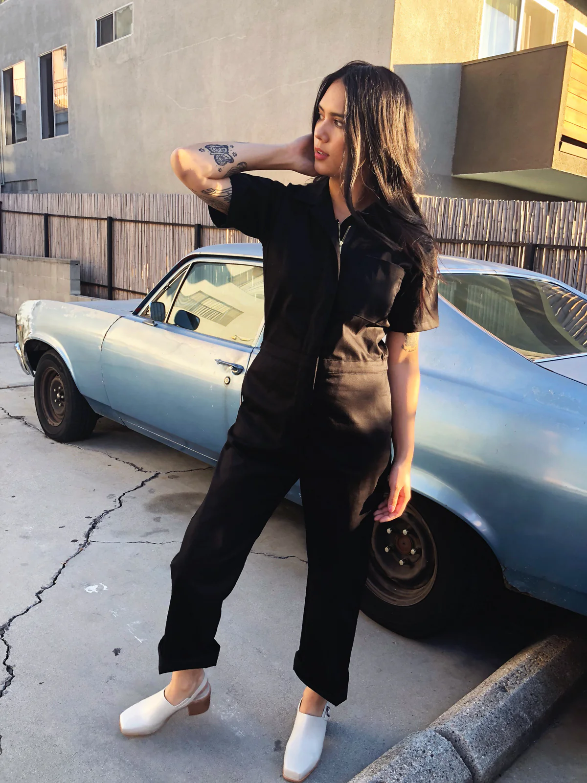 Behold your new uniform. The most comfortable fitting coveralls made in our stretch cotton twill. Featuring a relaxed full length silhouette with short sleeves, a brass zipper-front closure, one chest flap pocket and side slash pockets. Now stop looking so good and get to work!