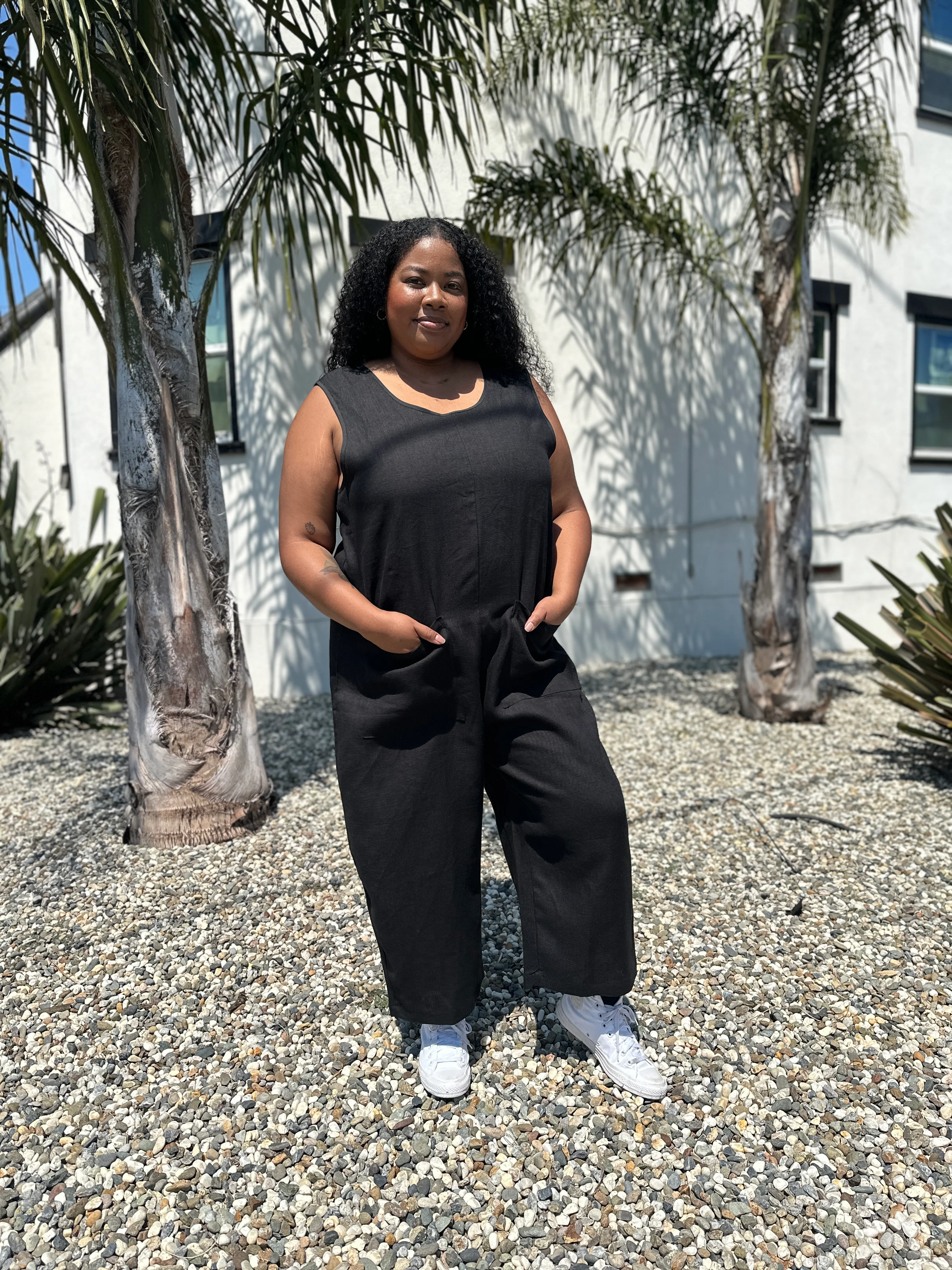 We felt like our dreamy linen fabric needed an equally dreamy oversized jumpsuit to match its easy breezy feel. This unisex onesie slips right on and zips up the back. Great for hot days when you want a loose fit or cool days when you want a fun layering piece!