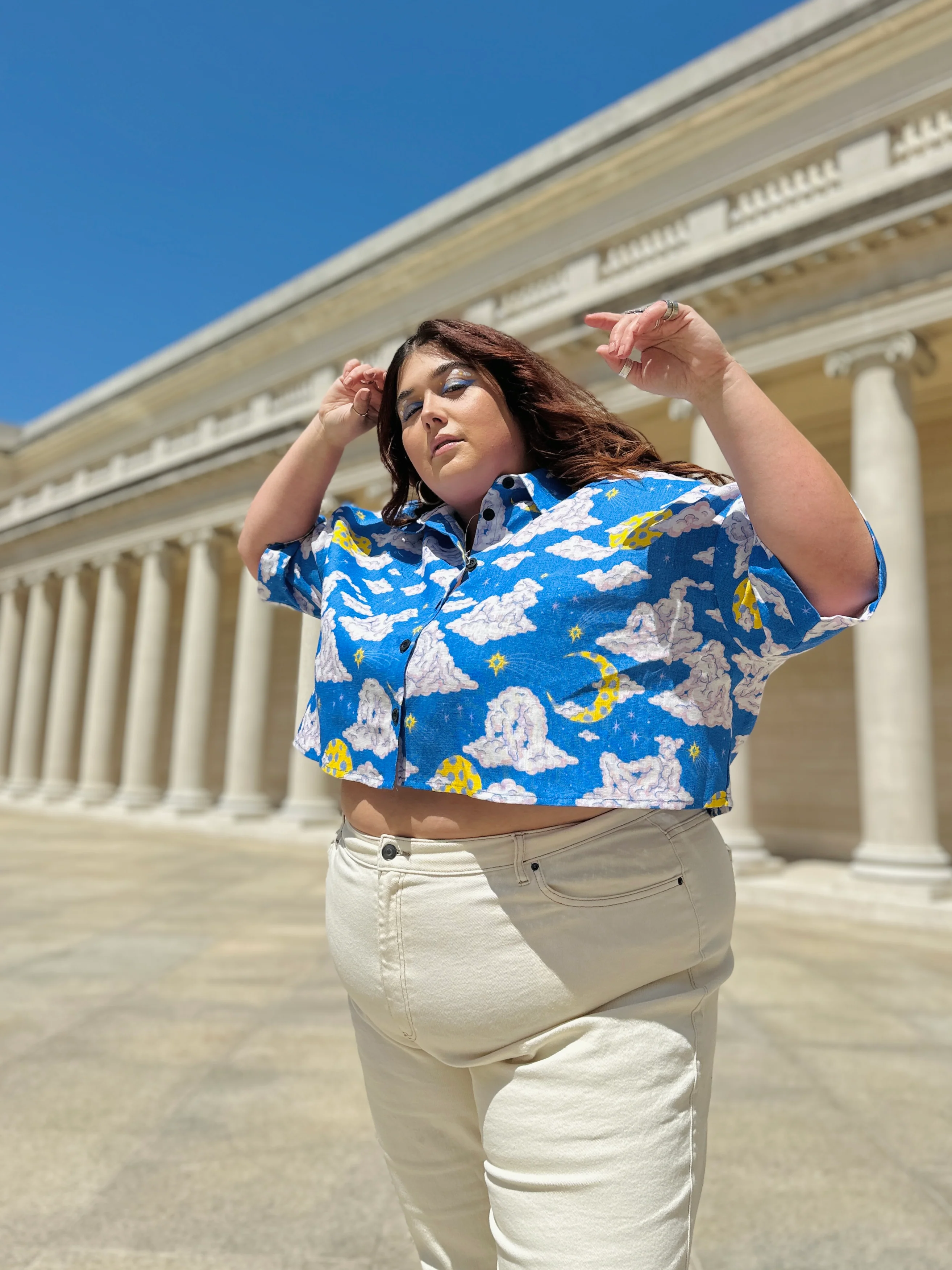 Our new linen Olivia top is easy breezy and cute! It has a boxy and oversized silhouette, cropped length, and dropped shoulder seams. It has a nice flat laying collar and buttons all the way up! It's running a tad big, so we recommend sizing down on this one. Pair it with the Linen Catalina pant for the perfect all over linen look!