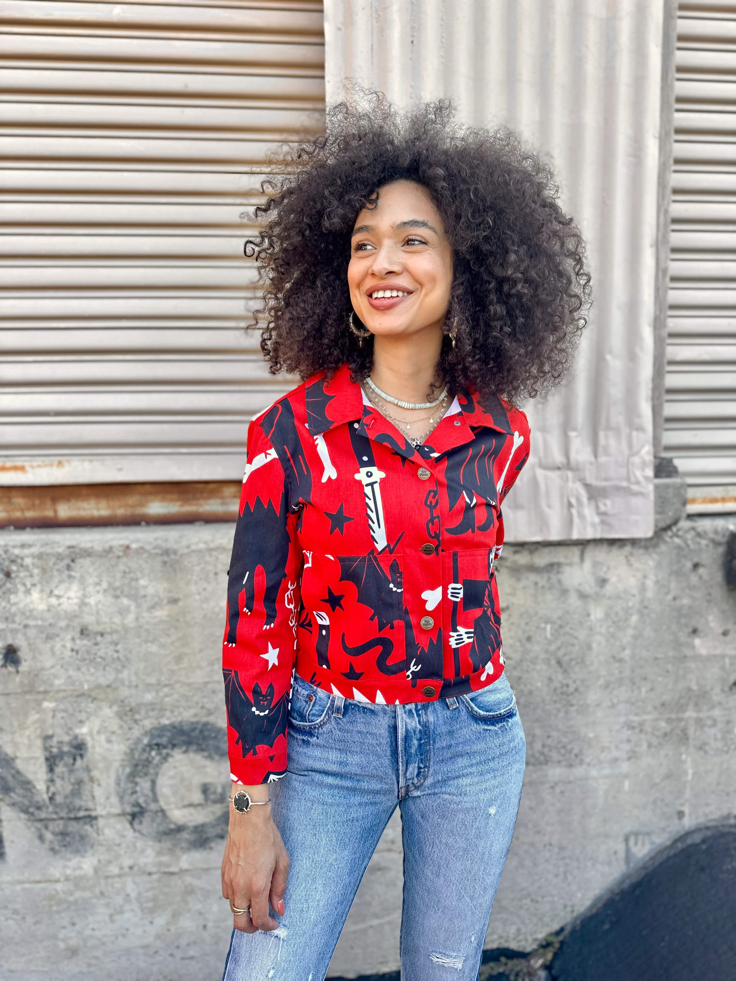 One of our favorite local designers Liz Thayer aka Claflin Thayer, & Co. has the sweetest shop with the most perfect custom jackets, one of those jackets is The Shorty Jacket. It’s our dream jacket, so we licensed her pattern and graded it up to 5x and made it in our beautiful prints!
